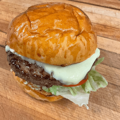 8 oz black Angus beef, lettuce, tomato, onion, mayonnaise on a brioche bun