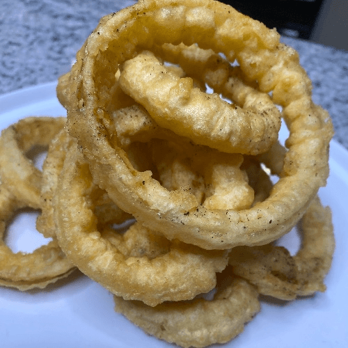 Crispy onion slices deep-fried until golden-brown