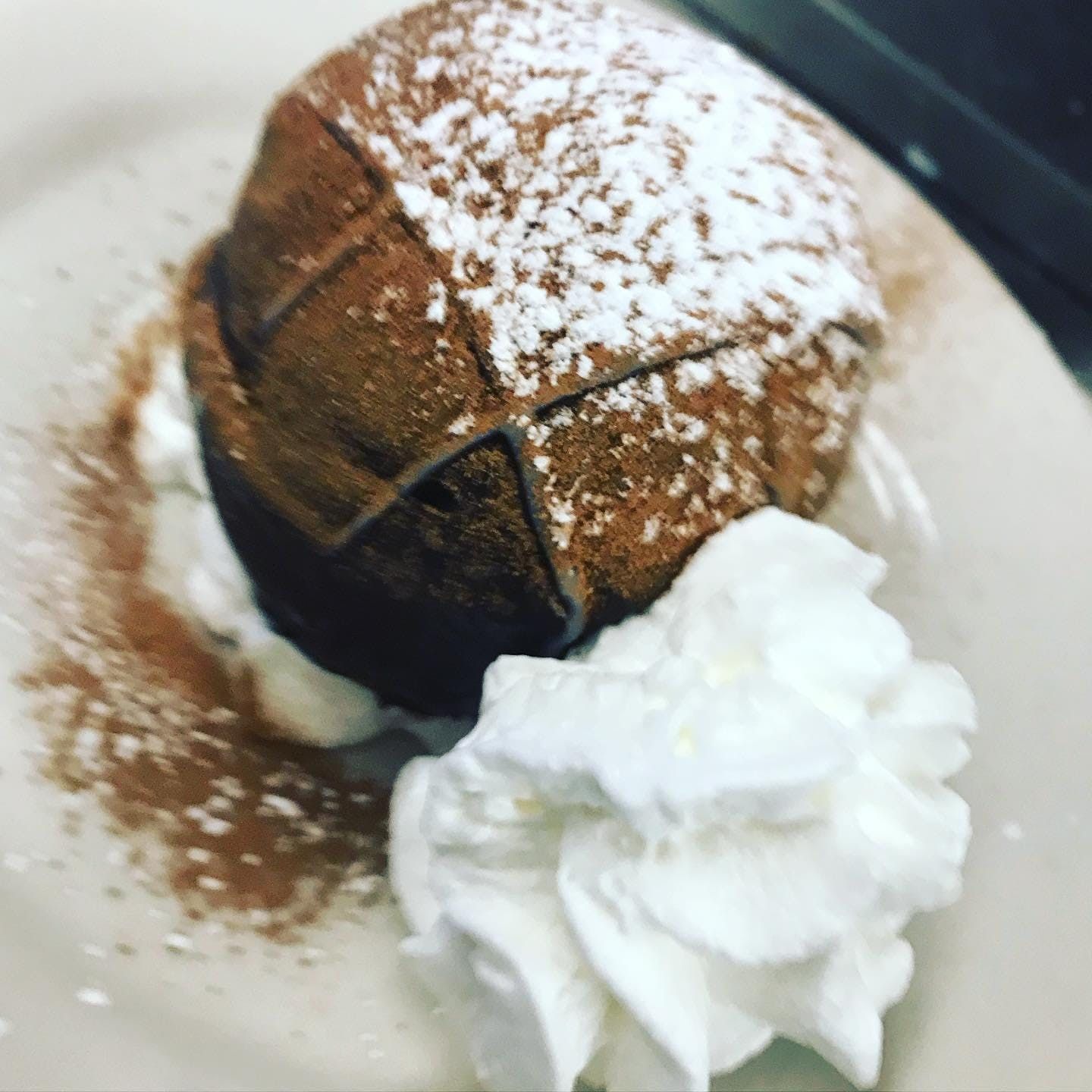 Dessert. Regular dessert/ice cream, covered in powdered sugar with vanilla-lemon custard in the middle