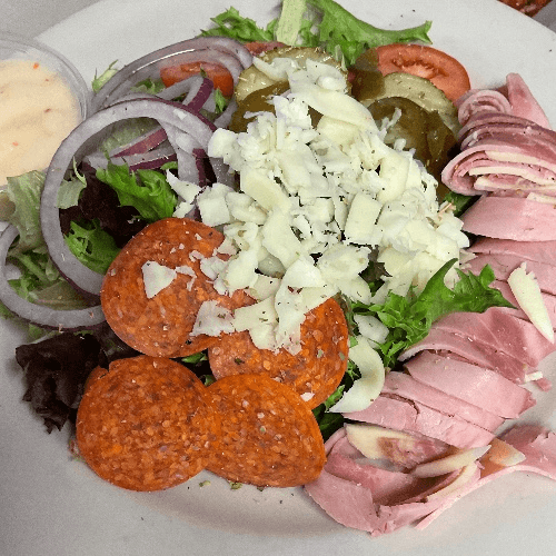 Spring mix, topped with cheese, ham, salami, pepperoni, tomato, onion, peppers, and pickles