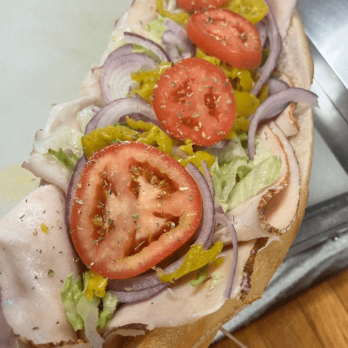 Hoagie. Mushrooms, eggplant, tomato, onion, peppers, and black olives, topped with sharp provolone and baked in the oven.