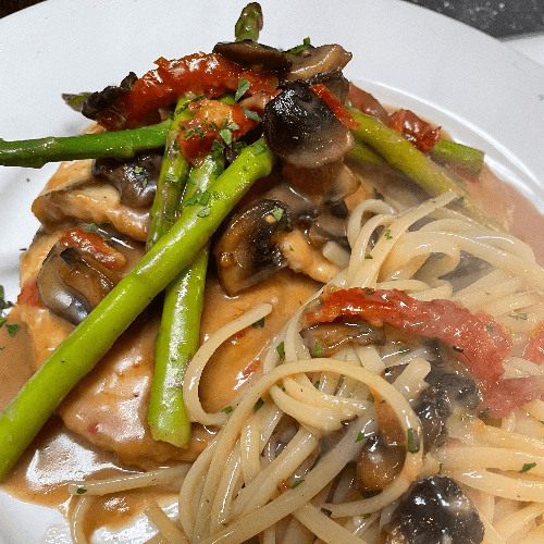 Entree. Mushrooms, sun-dried tomato, asparagus, sherry wine sauce. Served only from 04:30 pm - 09:30 pm